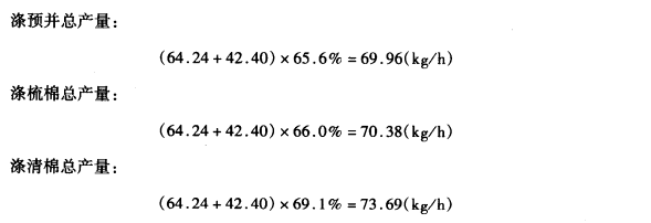 已求得织物的经、纬纱总用纱量分别为64.24kg/h和42.4kg/h,即经纱的细纱总产量为64.24kg/h,纬纱的细纱总产量为42.40kg/h。按上述公式可计算出各工序的总产量。
