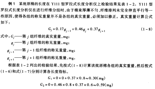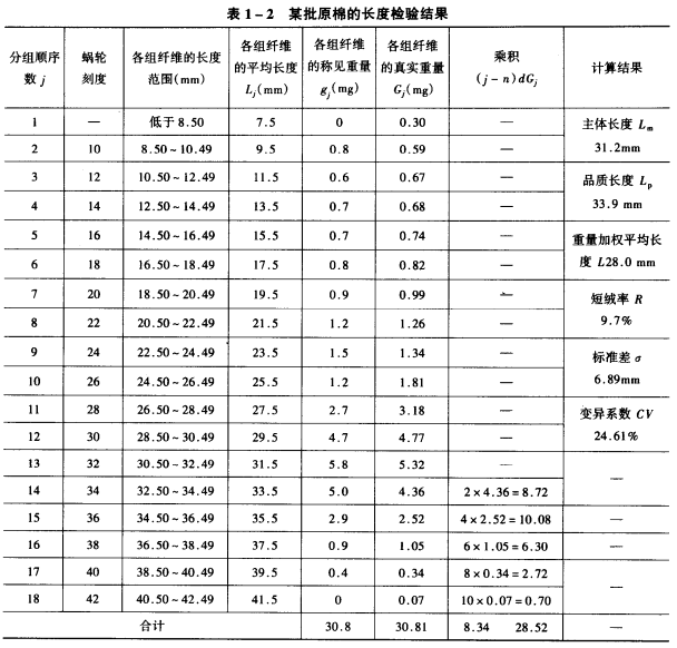 1.手扯长度与长度级 所谓手扯长度,是指用手扯尺量的方法所测的原棉中根数多的纤维长度,简称长度。就是从被检验的棉花中,取出少量的棉样,经过手扯整理,使棉纤维伸直平行、排列有序.找出具有代表性的众数长度即为手扯长度。手扯长度以1mm为级距,分成25mm、26mm、27mm、28mm、29mm、30mm、31mm七级,28mm为长度标准级,分级范围见表1—1。五级棉花长度大于27mm,按27mm计;六级、七级棉花长度均按25mm计。