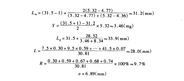 2.主体长度 也称众数长度,是指纤维长度分布中,占重量或根数多的一组长度由于该方法是以重量加权的,所以主体长度必然落在重量大的一组中,但一组的组距是2mm,主体长度究竞在组中哪一点,还需要根据重量大的一组和其相邻两组的重量关系求得。主体长度的计算公式为: