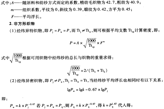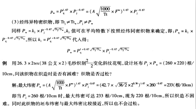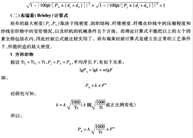 假设纱线不变形、不重叠。计算织物大密度的公式很多,其小比较著名的计算式有两个,分别为皮尔斯(Peirce)理论计算式与布瑞莱(Brieley)经验计算式。