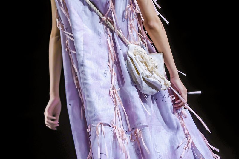 为了契合报童的原始形象,本季使用了较多的挎包元素,并将其解构为外套或可拆卸的配件来增加服装的趣味性;衣服上的蝴蝶结、抽褶等细节体现出无差别时装品牌的特色,不为服装下定义而是由消费者来决定衣服的形态,从而强化服装的可穿性和互动性。
