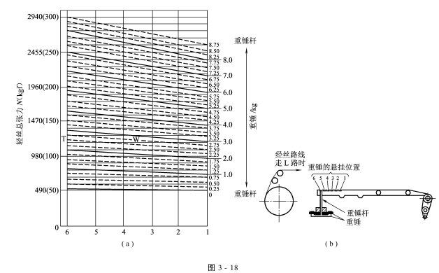 图3-18所示张力与重锤的关系,只是理论计算值,只能作为参考。实际应在织机上机运转后,视其运转情况而定。