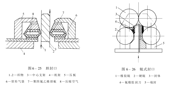产生高温高压饱和蒸汽的首要条件是能承受一定压力的封闭系统的存在。因此,系统的密封性是高温高压汽蒸设备的关键。它既要保证织物能连续地进出高压汽蒸箱,又要耐磨,具有一定的寿命。如果是间歇生产,则可用静密封来解决,一般用螺栓把箱盖和箱体及填在它们之间的橡胶垫片压紧即可,如高压煮练锅。对于连续生产的高温高压汽蒸的密封,一般有唇式和辊式两种。简单的唇式密封口,是用两片四氟乙烯制成的唇式夹片,用它压触运行织物,形成密封。由于夹片与织物间的摩擦严重,对有色织物易产生条花。在唇封上若积有污物,则将沾污织物。因此,一般不适用于高压染色和印花后织物的汽蒸。图6-23是一种常用的唇式汽封口。上唇由不锈钢制成,下唇为外包聚四氟乙烯薄膜的橡胶充气袋,袋内气压为68.6kPa,使下唇紧贴上唇,织物在其间通过,蒸汽不易外泄。