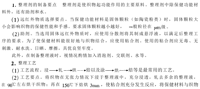 3.向功能复合化发展 人们对于一种新产品的要求不再只是要具有单一的功能即可,而是要求功能复合化。为适应各种消费需求,在纺丝液或后整理剂中同时掺加远红外粉和其它的功能制剂。如将远红外物质和阻燃剂、抗菌剂、消臭剂、防虫剂等各种功能制剂复合附着于织物上,使得产品具有更广泛的保健功能性。