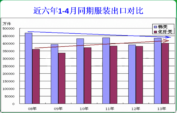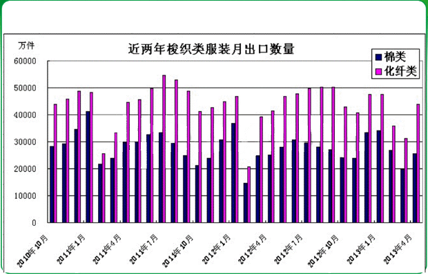 自11年以来化学纤维类工作装出口数量超过棉类,而12年工作装出口总量低于11年,且化学纤维类比例继续上升。