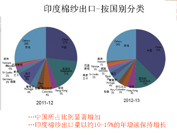 全球第二大生产商。 大的棉花纱线出口国(占24%)。 拥有4800万锭产能(每年新增300万锭)。 产量在480万吨。 75%是棉花纱线,其它是一些混纺化纤织物纱与人工合成类纺纱线。 20%出口80%用于内销。 高效现代化的纺织技术。 LMW(朗维),站达,Trutzschler,赐来福,村田,KTTM足主耍的机械供应商。