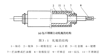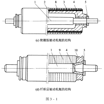 1.轧辊的分类 轧辊是轧车的主要部件,轧辊可分主动轧辊与被动轧辊。主动轧辊由传动装置直接拖动,而被动轧辊则由主动轧辊摩擦带动。 主动轧辊的辊面普通硬度较高,通常用硬橡胶、铸铁制成,并镀铜或包不锈钢等。近年来,在上色机、亚漂机等机台上,轧车的主动轧辊实用软橡胶制成的。 被动轧辊的辊面须具有弹性。因此,被动轧辊普通都用软橡胶制成,也实用由棉纤维、麻纤维与纸层重叠,经高压压制而成的纤维辊。主要是为了幸免布料经过轧点时受损及缝头处经过轧点时发生断裂。 轧辊也可根据辊面材料命名,如硬橡胶辊、不锈钢辊、贝纶轧辊(微孔轧辊)等。为了预防沾料,在有些新型轧辊的表面均匀涂敷一层PTFE材料。 2.轧辊的结构 轧辊的结构形式很多,普通由轴芯、轴体、外包层、红套圈、瓦爿销等组成。常用的几种如图3-1所示。