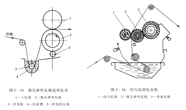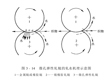 微孔弹性轧辊的轧水机理如图3-14所示。由于辊体微孔的毛细管作用,当弹性轧辊和布料接触时,面料中的水分被吸到微孔中。同时,由于辊体具有较好的弹性,当布料进入轧点至轧点中点(图中ao段)时,微孔中水分及空气被压出,且轧辊对布料纺纱线间的水分进行挤压;当面料进入轧点中点至出轧点(图中ob段)时,轧压力减小,辊体归弹,微孔扩张恢复,形成局部负压,布料中的水分被吸到微孔中,大大降低了轧余率。 为了使微孔弹性轧辊延续工作,必须将吸入微孔中的水分及时排出,图3-15为其延续轧水的示意图。在微孔弹性轧辊轧点的另一侧,安装一根附加挤压辊,用它即可将轧辊微孔中的水分预先挤压排解。微孔弹性轧辊不仅可提高轧水效率,而且由于轧压力较低,对加工布料与轧辊自身的损伤很小,尤其适用于针织物物等不宜承受高压的面料。但是,随着使用时间的增添,轧辊的弹性将会逐渐减低,影响轧余率。其它,由于轧辊微孔吸水需用肯定时间,因此,限制了车速的提高。
