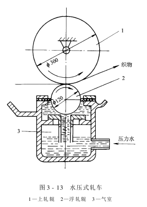 图3-12所示是气袋均布加压式轧车示意图。轧车顶部有一只气袋。当压缩空气进入气袋后,迫使气袋向下膨胀,通过双排支承座及多个小压力辊,使小直径的上轧辊加压。这种轧车的轧余率可比普通轧车降低20%左右。而且,轧液比较均匀,压力波动也小。其缺点是加压与卸压的动作比较缓慢,且上轧辊表面易被压力辊磨损。 3.水压式轧车