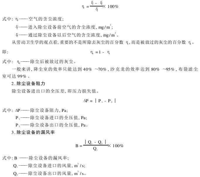 G1 ———进入除尘设备空气中所含的灰尘分量,kg/h。 除尘效率也可以用空气的含尘浓度来表示。即用进入除尘设备前空气的含尘浓度与通过除尘设备以后空气的含尘浓度的差和初含尘浓度之比表示