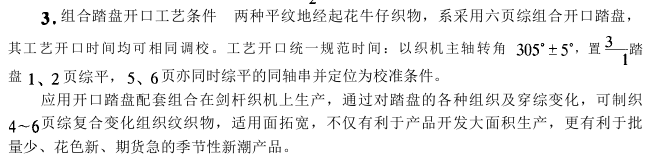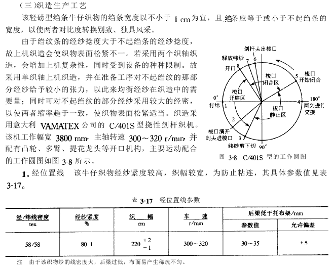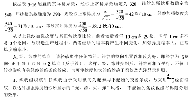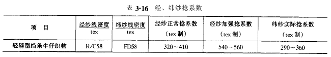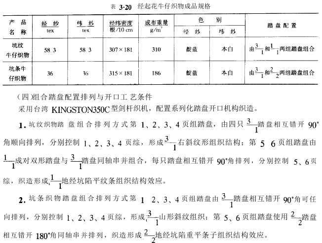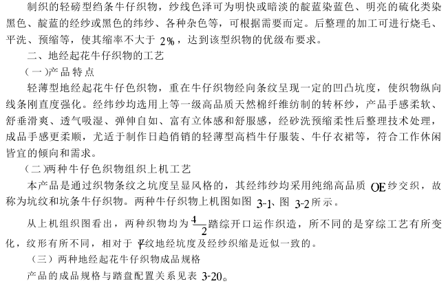 一、三合一绉条牛仔布料设计 (一)产品特点 以不同捻度的麻/棉(55/45)经纱,按纵条相间罗列并和无光粘纤进行交错,经水洗石磨,使面料形成平纹条和绉纹条交替浮现,面料轻柔、挺括,具有粗犷豪放、潇洒自然的特色。该产品可去除由于经纱缩率不一需用双织轴织造的麻烦。 (二)绉条牛仔布料组织结构设计 该绉条牛仔布料为轻磅型,规格见表3-15。