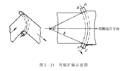 弯辊扩幅的原理是当织物以肯定的压力紧贴弯辊辊面,并按图2-21所示的方向运行时,由于织物和辊面间存在静摩擦力的作用,使织物的纬向幅度随弯辊母线由AB位置转到CD位置时,弯辊的母线增大。因此,织物纬向幅度也就随之增大,即产生了扩幅作用。 弯辊的安装位置直接影响其扩幅效果。首先,弯辊的弧突方向必须和织物的运行方向一致,才能起到扩幅作用,否则,将使织物纬向发生收缩。其次,织物和弯辊的包角越大,扩幅能力也越大。但包角不能大于180°,否则,也会使织物纬向产生收缩而起皱。再次,对织物的导入角φ 肯定要大于导出角φ ,见图2-22(a)、图2-22(b),这样,可预防织物边缘和弯辊接触松弛,从而增强扩幅力。在安装弯辊的前后导布辊时,肯定要注意这一点。其它,当弯辊中部向下倾斜时,能使φ >φ ,见图2-22(c),扩幅力增大。因此,适当改变弯辊芯轴的安装位置,可调节弯辊扩幅器的扩幅能力。
