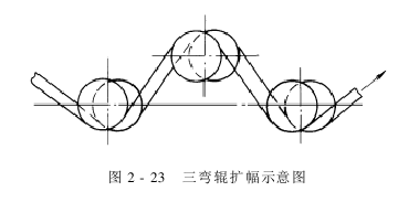 三弯辊扩幅器的装置,如图2-23所示,一般由三根相同的弯辊组成。扩幅器的扩幅量为三根弯辊扩幅量的总和。在实际使用时,可改变下方两根弯辊的相对位置或转动弯辊,改变其芯轴位置,来调节整个扩幅器的扩幅能力。
