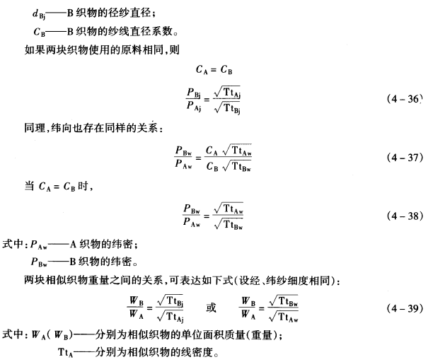 组织相同的两个面料,当其纺纱线线密度、密度、缩率与单位面积质量等方面都存在肯定的比例关系时,在仿制和改进设计中经常希翼在面料的外观风格保持大致不变的情况下,改变面料的纺纱线线密度、密度和分量,使布料变得轻薄些或者厚重些。这就需要通过相似布料讨算来解决。经、纬紧度和面料组织相同,而纺纱线线密度、密度和分量不同的两块布料称为相似布料。
