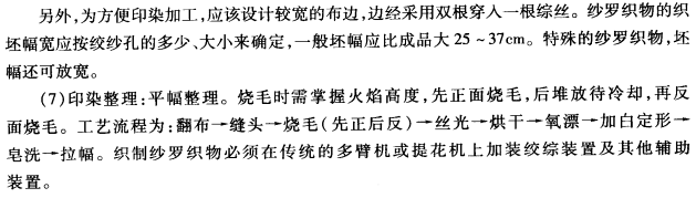 (3)装饰用中厚型纱罗布料:用16.9tex×4(35英文×4)聚丙烯腈纤维纺纱线或相应特数的毛型粘胶丝、合纤长丝等,布料丰厚柔软,富有仿毛风格或仿绸风格。